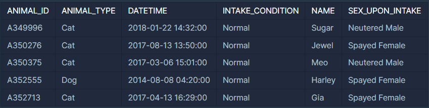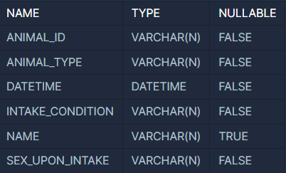 `ANIMAL_INS` 테이블은 동물 보호소에 들어온 동물의 정보를 담은 테이블입니다. `ANIMAL_INS` 테이블 구조는 다음과 같으며, `ANIMAL_ID`, `ANIMAL_TYPE`, `DATETIME`, `INTAKE_CONDITION`, `NAME`, `SEX_UPON_INTAKE`는 각각 동물의 아이디, 생물 종, 보호 시작일, 보호 시작 시 상태, 이름, 성별 및 중성화 여부를 나타냅니다.