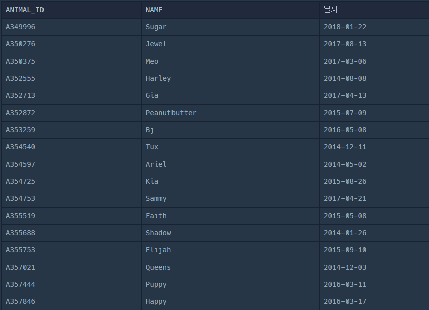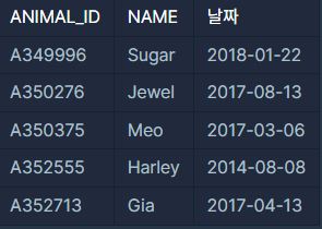 SELECT ANIMAL_ID, NAME, DATE_FORMAT(DATETIME, "%Y-%m-%d") AS 날짜